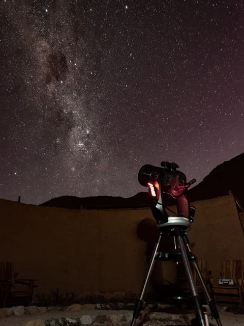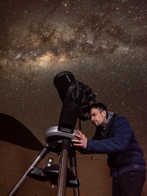 En tu visita a NOMADE, durante 90 minutos realizarás un completo viaje por el cielo a simple vista, reconociendo sus movimientos, sus áreas y constelaciones más interesantes y profundizarás en la observación, a través del telescopio, de aquellos cuerpos celestes más atractivos. Al finalizar te tomaremos una fotografía nocturna con el cielo y las montañas detrás.